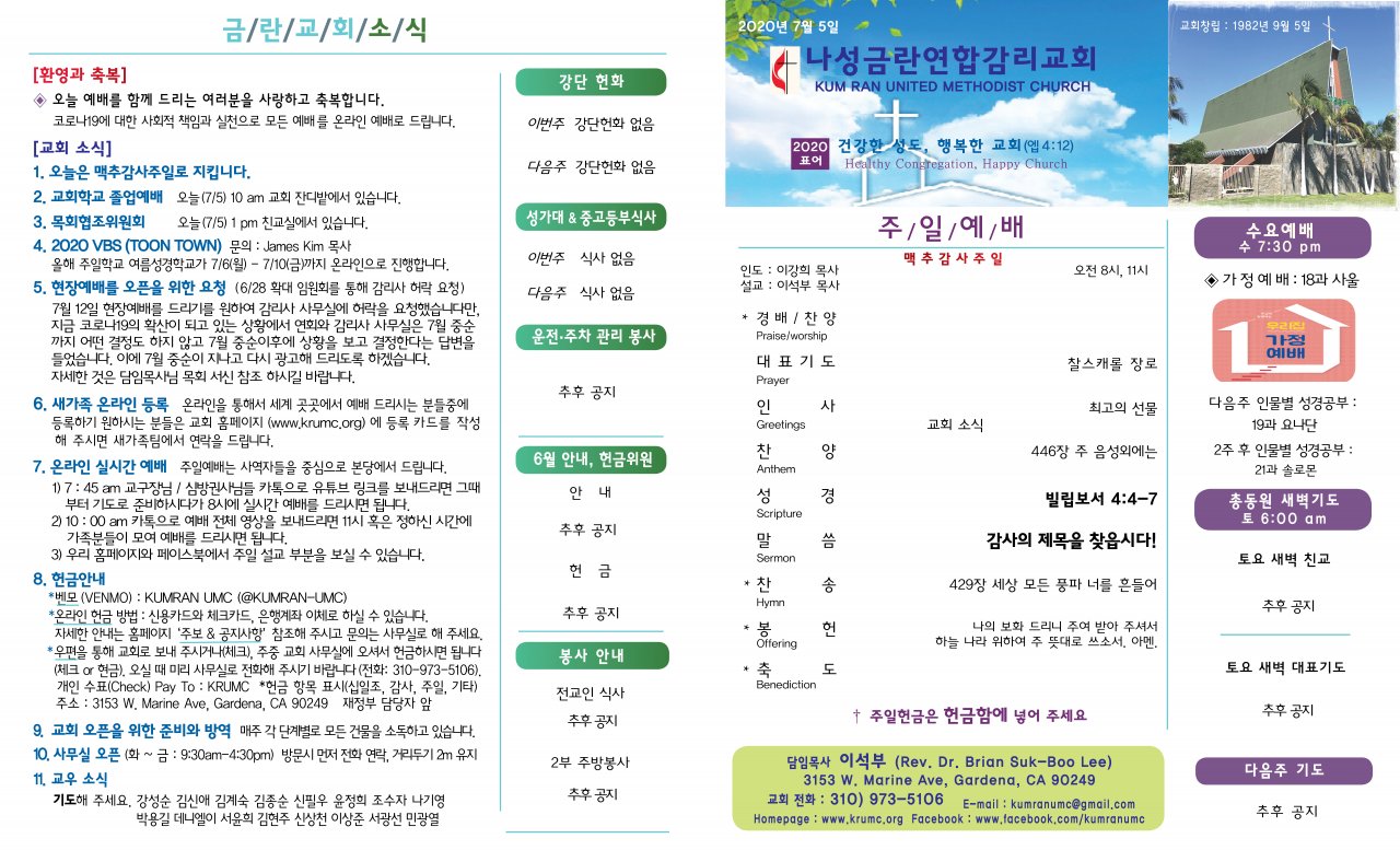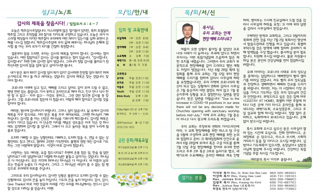 아랫글 : 7월2일(목요일) 현장예배 오픈에 대한 목회서신 (이강희)